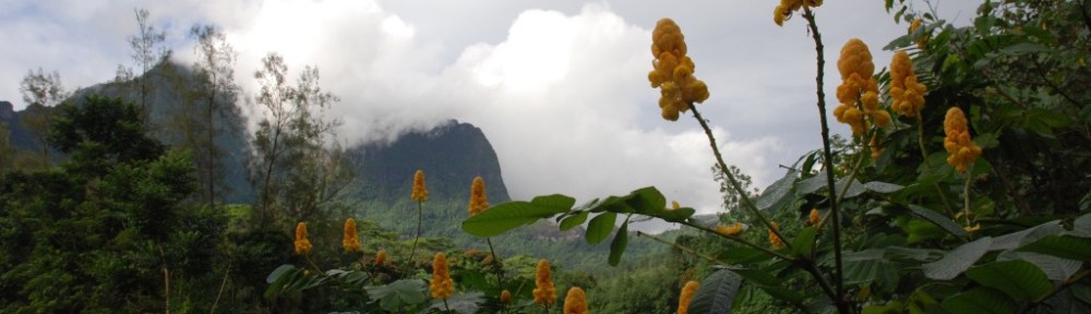 The clue should have been in the guide book title – hike to mountain view point. We are not overly keen walkers especially when the word mountain is in the sentence, so I’m not sure how we found ourselves pounding, in temperatures approaching 30C, the path 5 km up the road to the Moorea Belvedere, with its ‘spectacular views of rare natural beauty’. The road took us initially through gently sloping farm land, cows grazed, meadows lined the route, all was well. Gradually the road got steeper and was bordered with tall firs, fast running streams snaked to and fro, pineapple groves dropped down into the valleys. The final two km rose more sharply zigzagging upwards through jungle. We passed flowers of bright yellow, red and orange, shrubs with leaves the same size as us and others bright green one side, purple the other, large Banyan trees, stately Acacia and 30m high clumps of bamboo. At each bend and between each tree was the ever present dominance of the craggy slabs of rock that form the peaks here. Unfortunately our enjoyment of our surroundings gradually decreased in proportion to the steepness of the road, by the time we arrived puffing and soaked in sweat at the viewing point our ability to appreciate its splendour was seriously reduced.