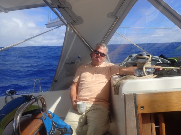 As I picked myself off the salon floor, made slippery by our sodden boots and lethal by the heavy seas, I felt I had hit, literally and metaphorically, a low point in this passage. We were both very tired, it has been a rough, grey and wet crossing, For a few moments I indulged in a wave of self pity, but it’s just us out here, no other option than to keep going, so we try to smile for each other and get on with whatever has to be done to get us to Fiji.