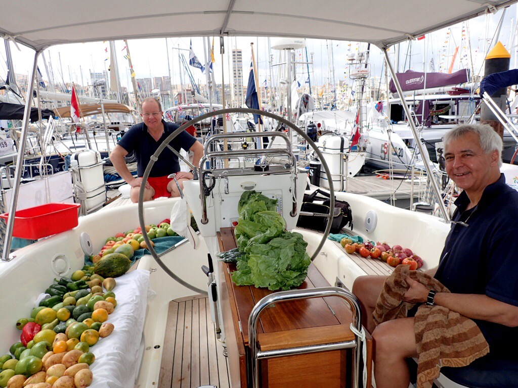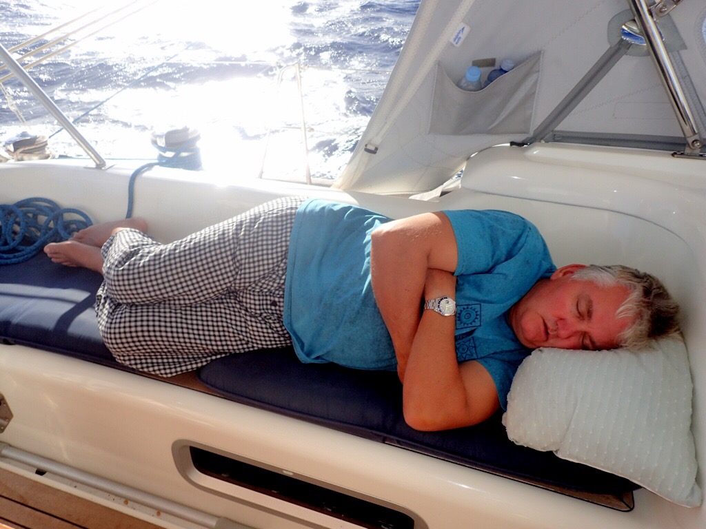 The French ports, rather conveniently, have computers placed in restaurants and small shops to allow easy check in. L’Alsace Kay served us cold beer and wine while we filled out the required forms and then lunch in their first floor restaurant overlooking the bay. The menu was in French, the boys took the easy route and ordered the dish of the day, chicken curry but Julia I opted to tackle the translation. I ordered ham with potato salad and Julia an onion tart from the vegetarian selection, or so we thought. What arrived was a little different, Julia was presented with a giant chicken vol-a-vent and I, a whole knuckle of ham. Luckily Julia does eat meat and decided it was too difficult to complain, the leftovers from my plate fed all four of us that evening!